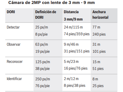 DORI (Detectar, Observar, Reconocer, Identificar) es un sistema estándar (EN-62676-4) para definir la capacidad que tiene una persona al mirar el vídeo para distinguir personas u objetos dentro de un área de cobertura. A continuación se muestra la distancia máxima a la que una combinación de cámara/lente puede cumplir estos criterios: