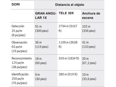 DORI (Detectar, Observar, Reconocer, Identificar) es un sistema estándar (EN-62676-4) para definir la capacidad que tiene una persona al mirar el vídeo para distinguir personas u objetos dentro de un área de cobertura. A continuación se muestra la distancia máxima a la que una combinación de cámara/lente puede cumplir estos criterios: